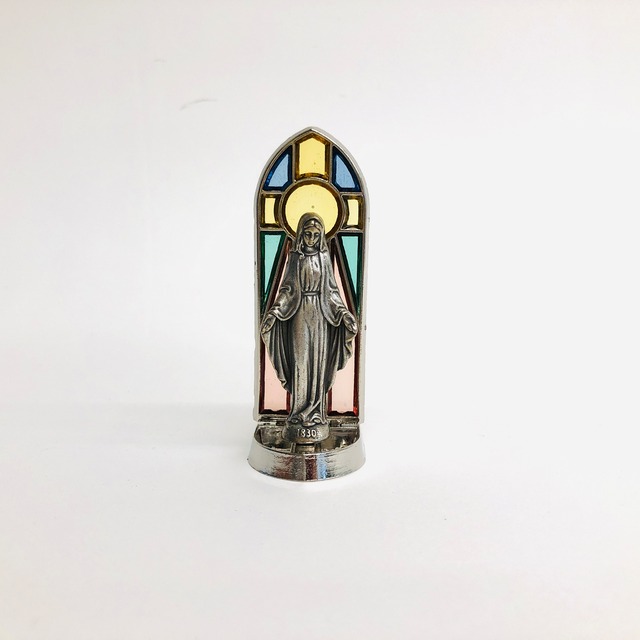 ビビットな色味のステンドグラス台を背にした、金属製の聖母像です。 ちょっとした隙間におけるサイズ感です。 SHOP URL:https://laparole.base.shop ■ サイズ / 重量 高さ 約11.5cm × 横幅 約6cm × 奥行 約2.5cm / 重量 約75.5g ■ 素材 金属製 聖母 / せいぼ / マリア / maria / 無原罪 / immaculate