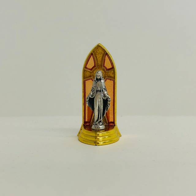 淡い色味のステンドグラス台を背にした、金属製の聖母像です。 ちょっとした隙間におけるミニチュアサイズです。 SHOP URL:https://laparole.base.shop ■ サイズ / 重量 高さ 約4cm × 横幅 約2cm × 奥行 約2cm / 重量 約8.5g ■ 素材 金属製 ■ その他 写真をご確認いただいたうえでご購入ください。 聖母 / せいぼ / マリア / maria / 無原罪 / immaculate