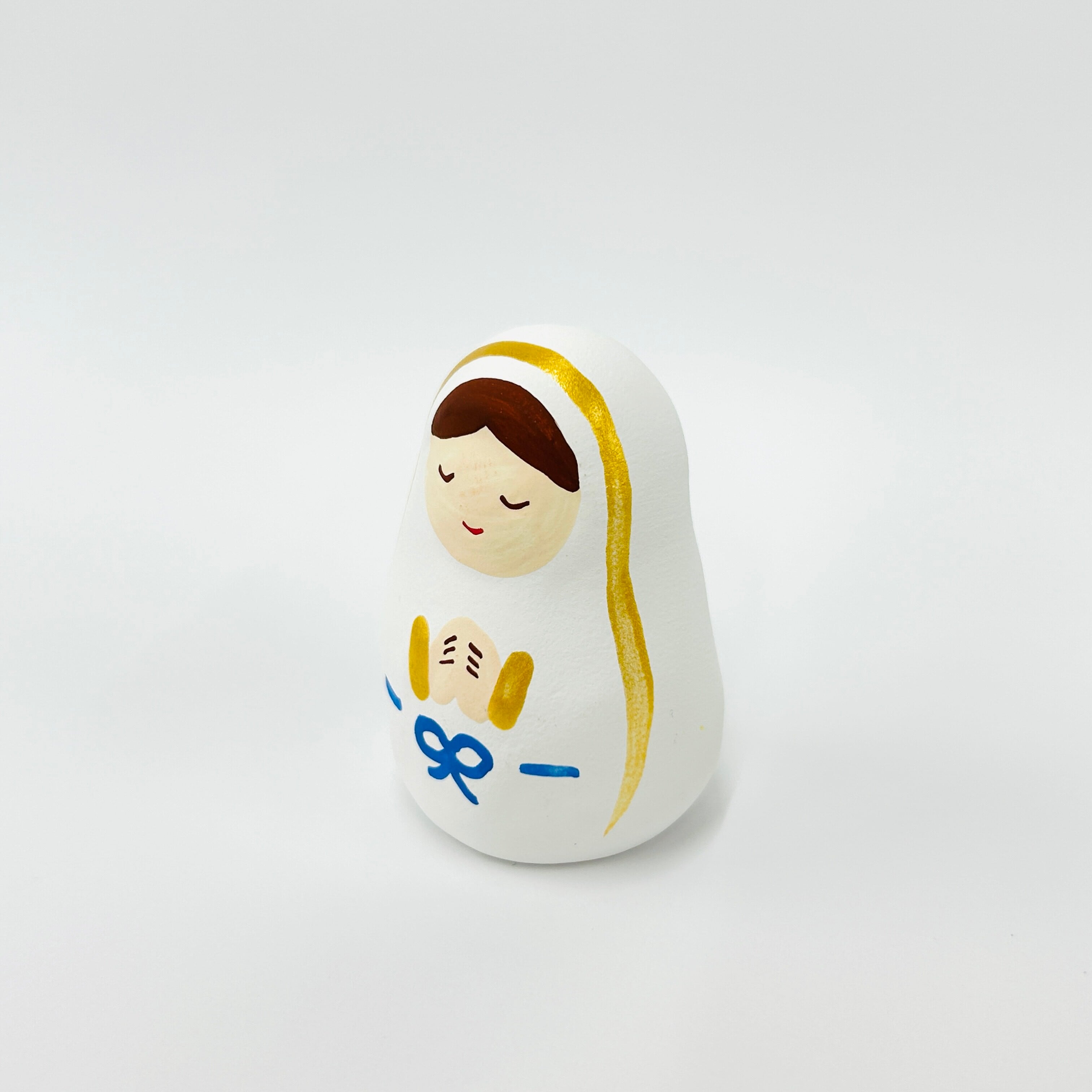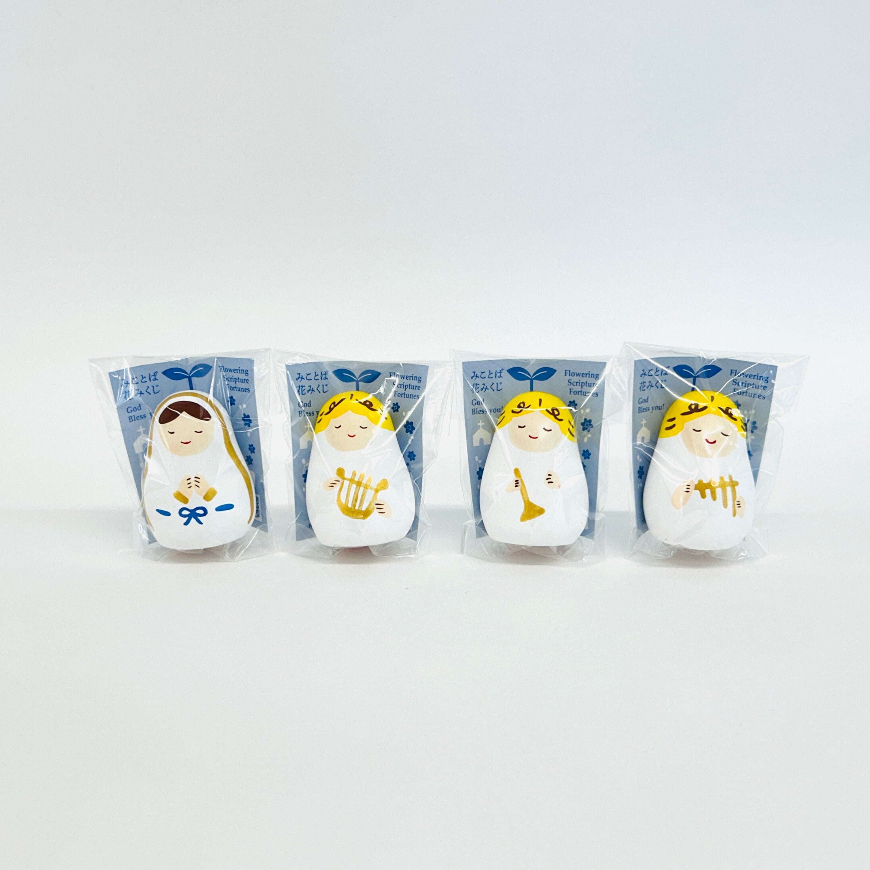 手のひらサイズの可愛らしい陶器人形の中には、24種類の聖書の一節と、その箇所についての神父さまからのメッセージが添えられたおみくじが入っています。さらに、水溶紙製のおみくじには花の種がセットされており、植物の成長とともに「みことば」をお楽しみいただけます。