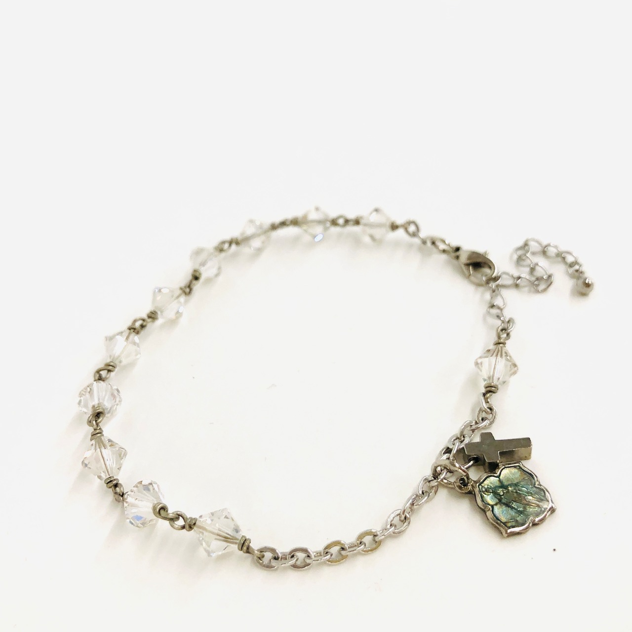 スワロフスキー社のガラス玉にメダイを組み合わせた一連ロザリオブレスレットです。