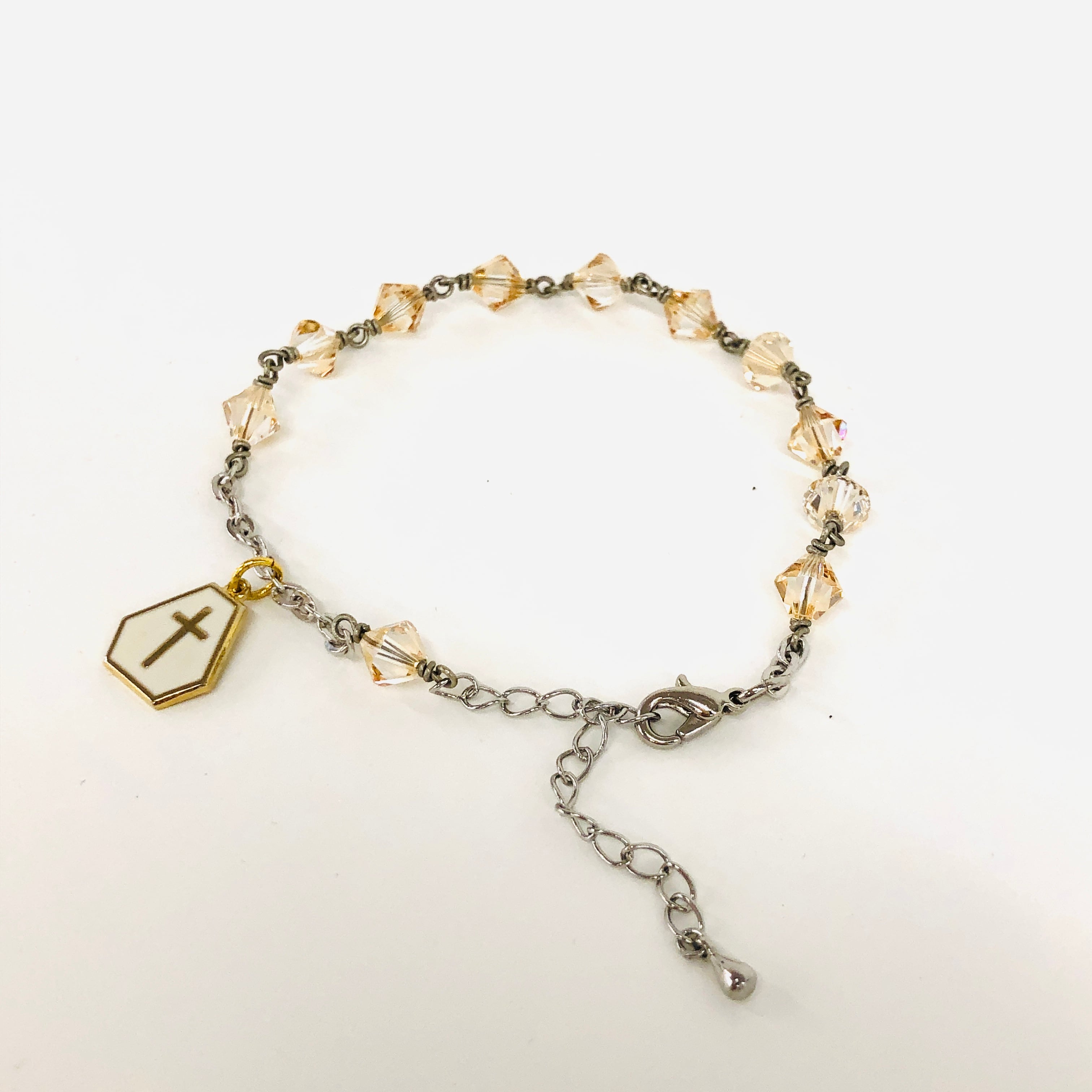スワロフスキー社のガラス玉にメダイを組み合わせた一連ロザリオブレスレットです。