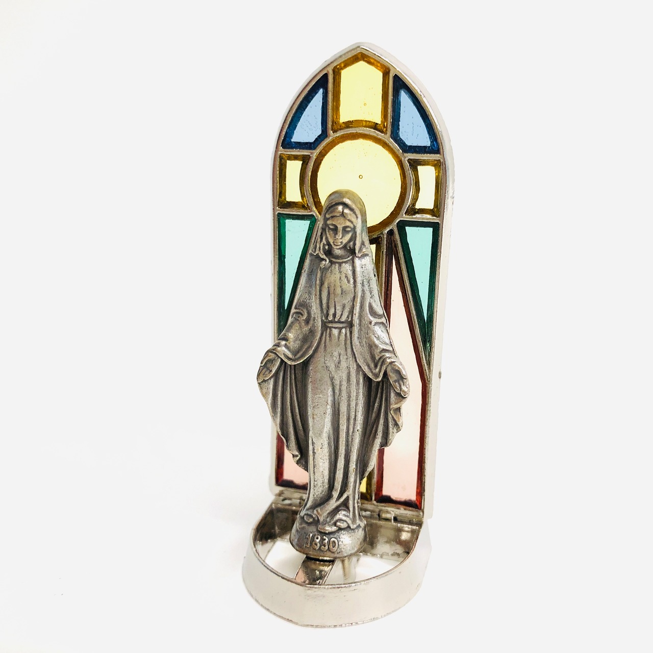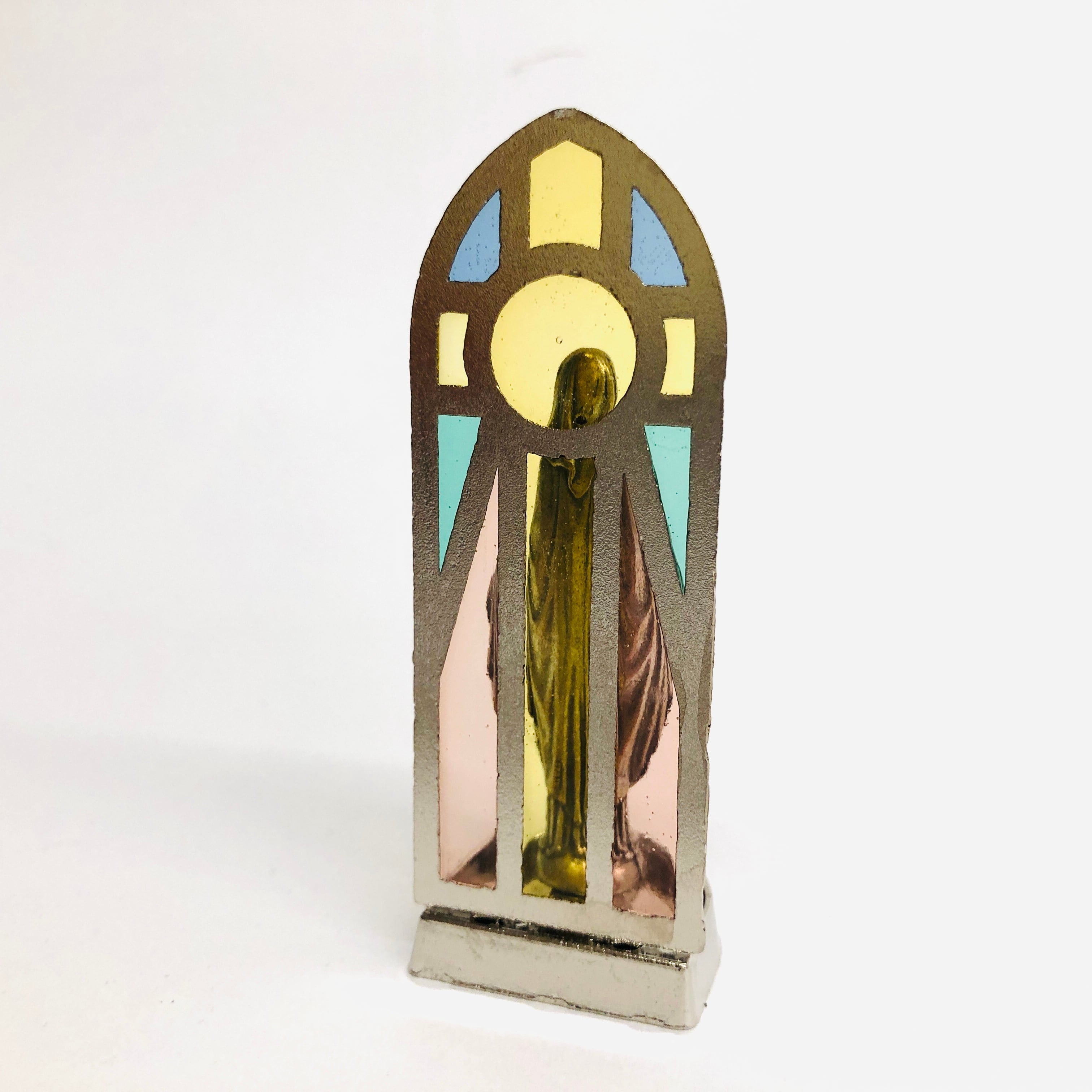 淡い色味のステンドグラス台を背にした、金属製の聖母像です。