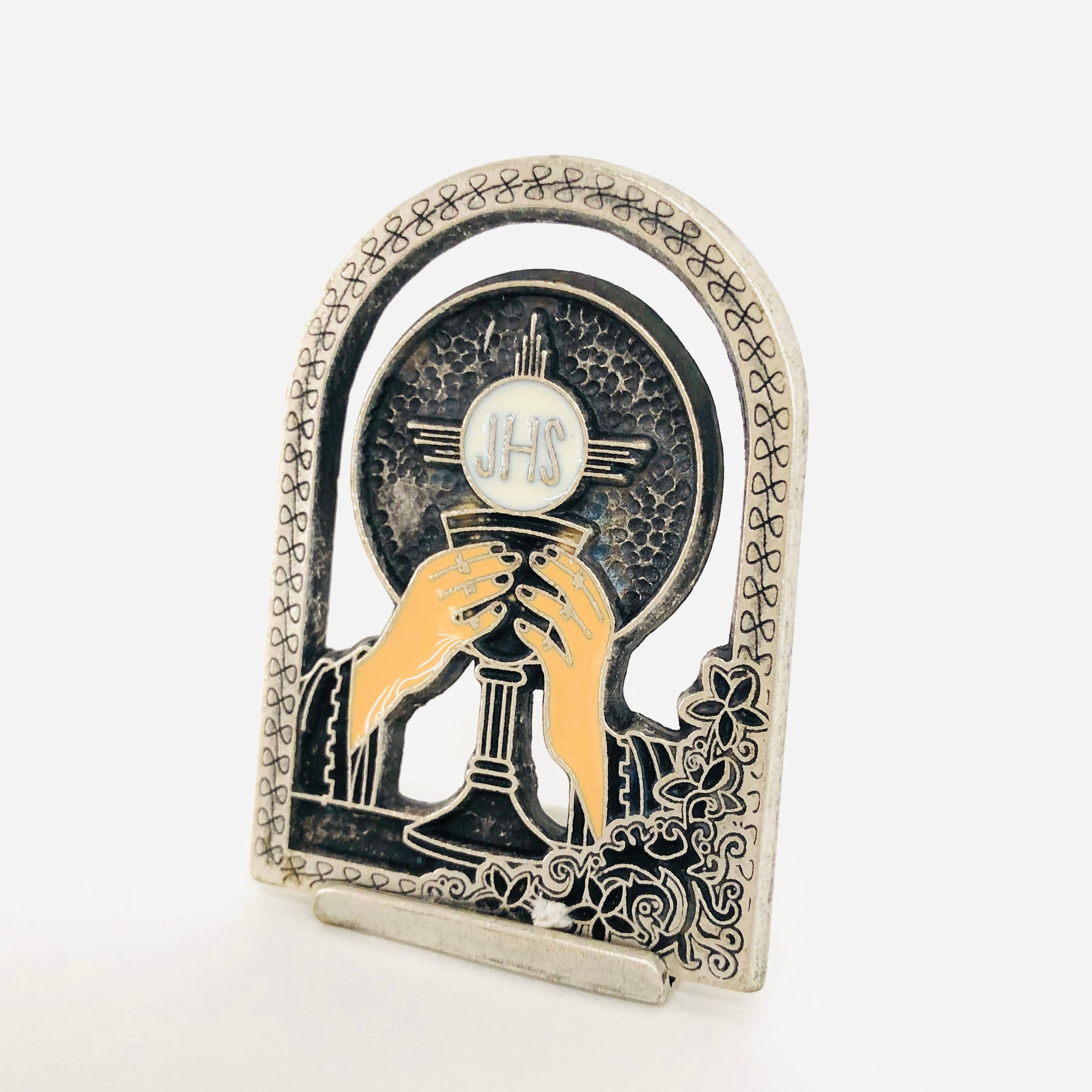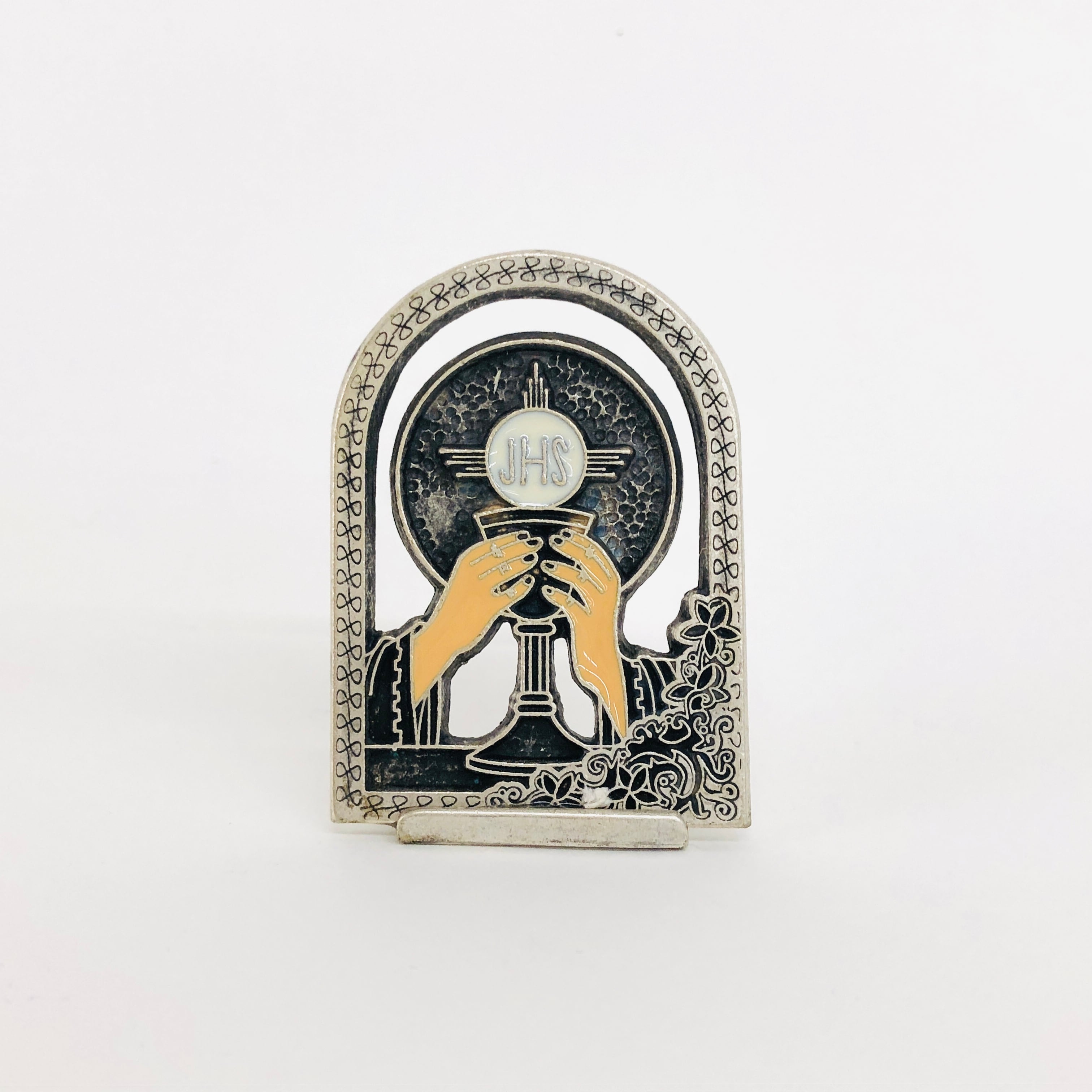 カリスを持つ手が特徴的な、金属製の卓上置物です。