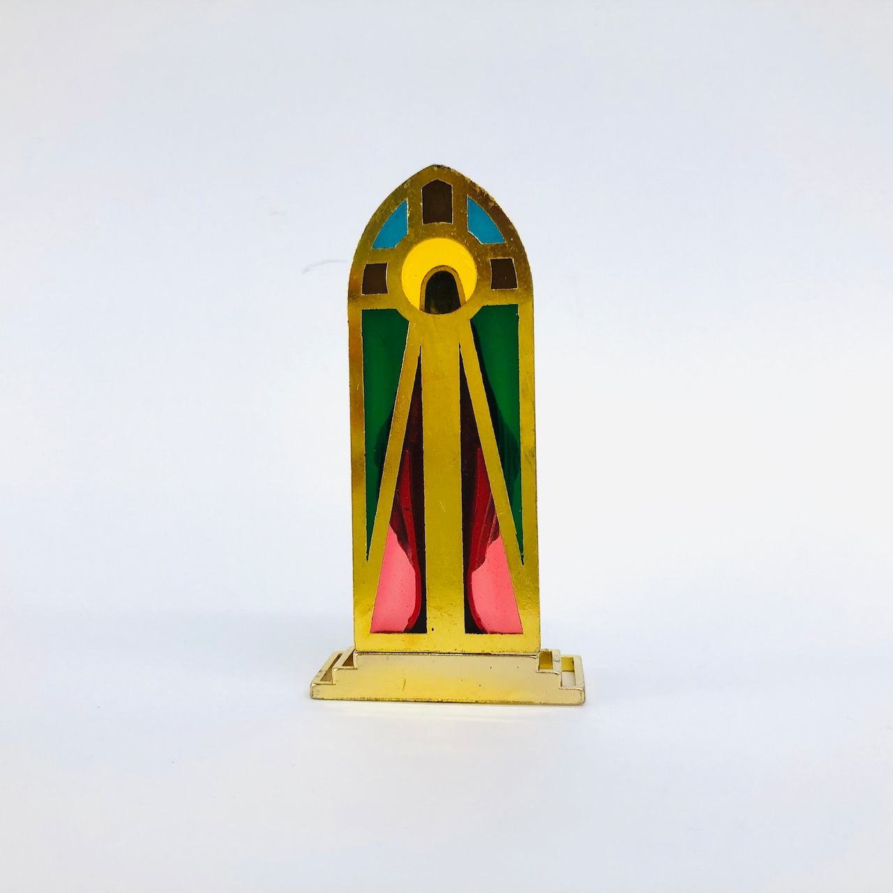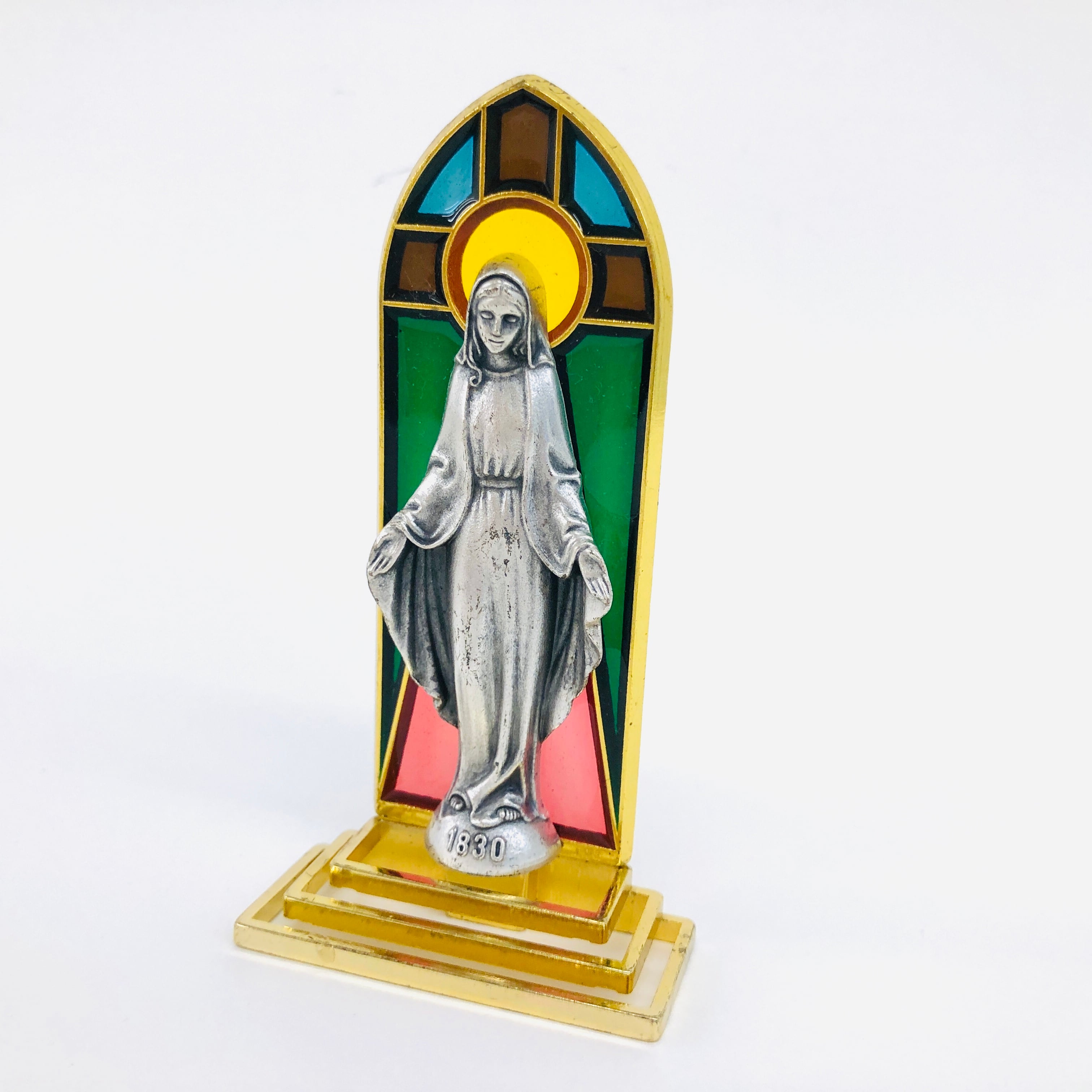 ビビットな色味のステンドグラス台を背にした、金属製の聖母像です。